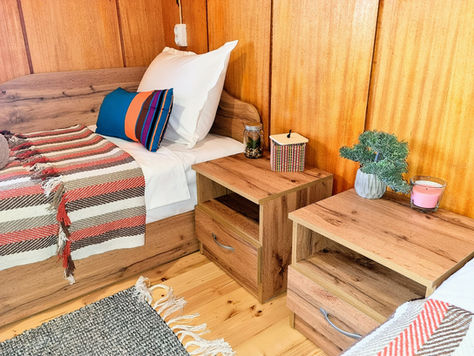 For campers who need a few days on a comfy mattress or nature lovers who prefer a bit more comfort, we offer several options. Our wooden cabins, each featuring a large double bed and two single beds, can accommodate up to four people. Every cabin has its own bathroom and access to our fully equipped main kitchen.